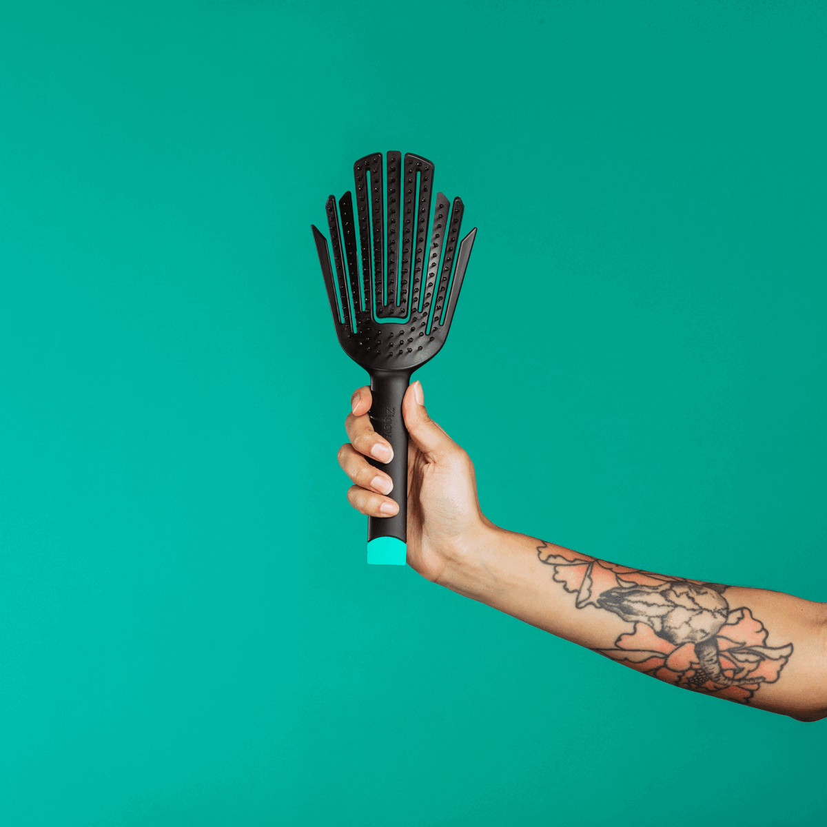 Unlocking the ultimate versatile brush. Our patented hand-shaped hair brush creates a vast variation of finger flexing movements through the hair. Each of the five fingers, unique in length and thickness taper along different pathways fanning out on individual planes. Each finger flexes independently, allowing you to manage your hair with precision like no other.