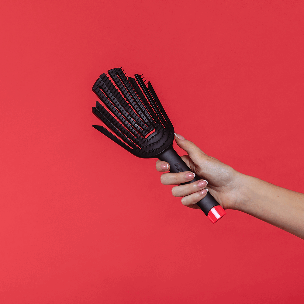 Unlocking the ultimate versatile brush. Our patented hand-shaped hair brush creates a vast variation of finger flexing movements through the hair. Each of the five fingers, unique in length and thickness taper along different pathways fanning out on individual planes. Each finger flexes independently, allowing you to manage your hair with precision like no other.
